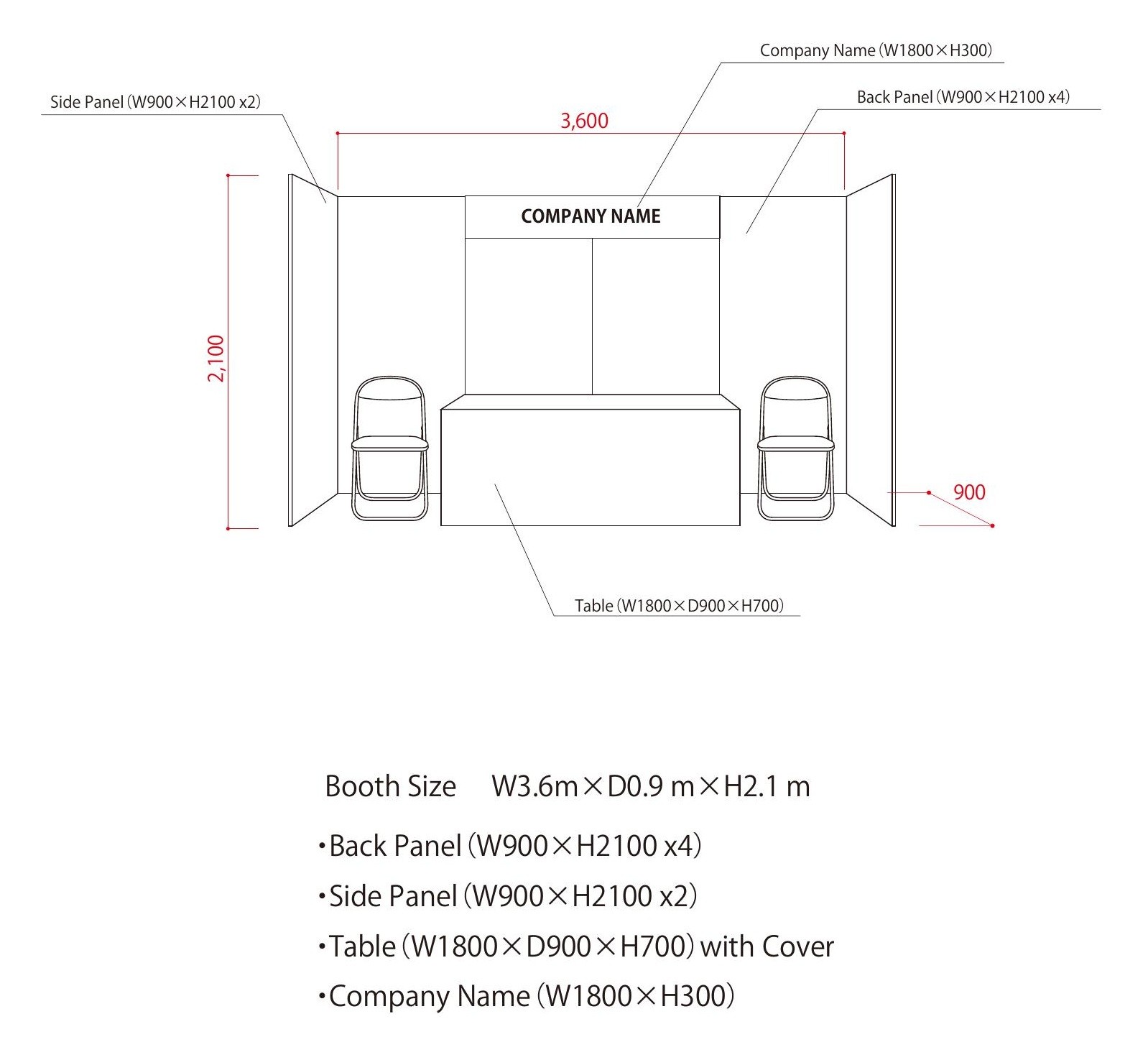 The exhibition booths will measure 3.6 meters in width, 0.9 meters in depth, and 2.1 meters in height. There will be two spotlights, a 100-volt 15A dual socket, and a panel displaying the company name in the center. The design of the panel is as follows. Two chairs and a long table will also be provided.