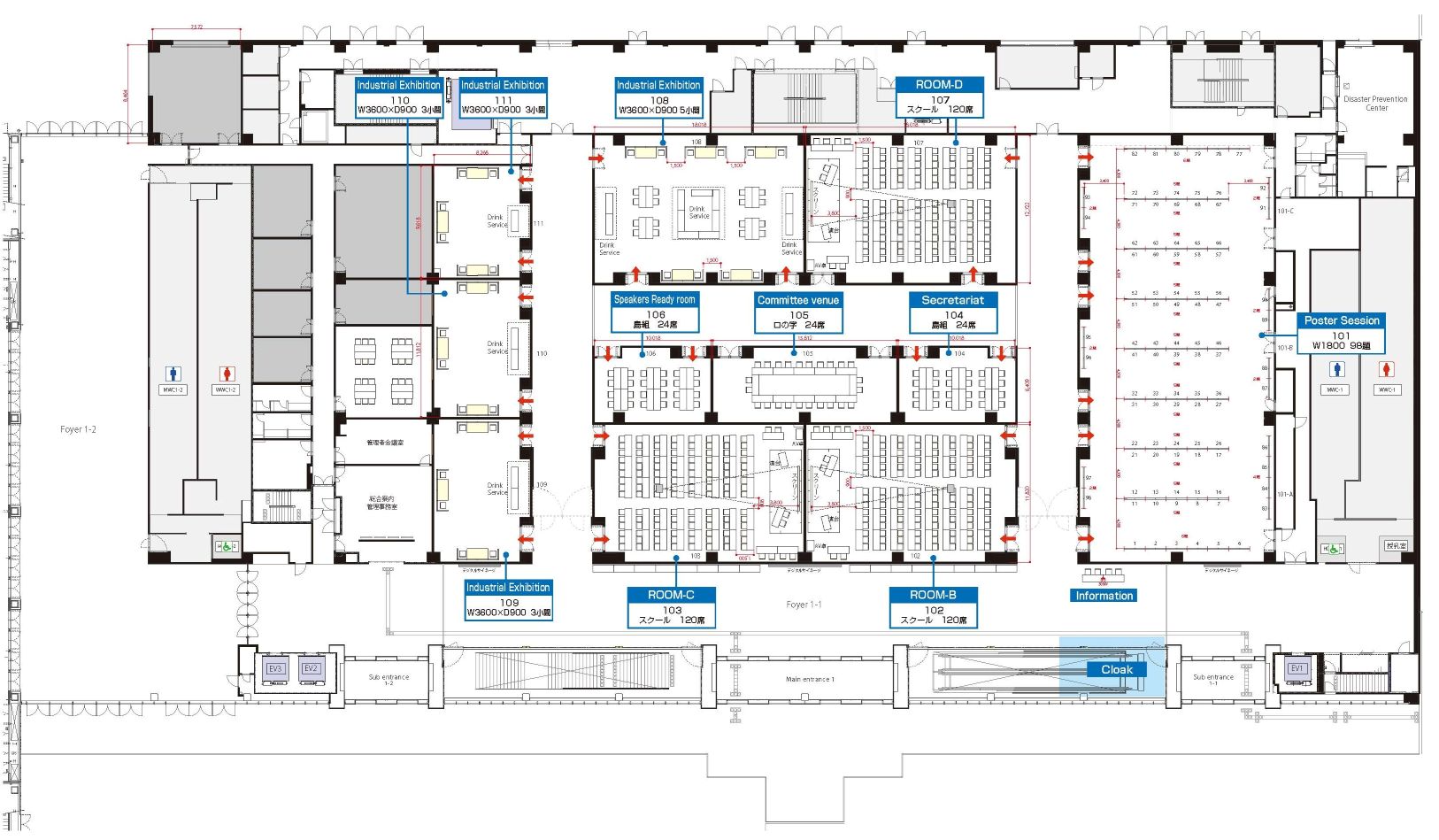 Welcome to the ISS2025 Industrial Exhibition. The ISS2025 Industrial Exhibition will be held in Meeting Rooms 108, 109, 110, and 111 at Dejima Messe Nagasaki. The Floor plan is as follows. Each meeting room will have 3 to 5 exhibition booths, and beverages such as coffee and snacks will be provided.